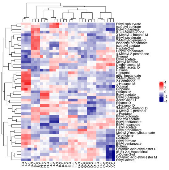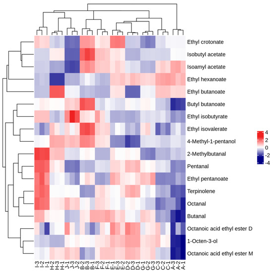 Hierarchical analysis was used to cluster the volatile aroma substances of the ten A. arguta wine samples with OAVs > 1. In the heatmap analysis of each variety (Figure 9), the red color indicates that the volatile compound was highly expressed in the samples, and the blue color indicates that the volatile compound was expressed at a lower level. The volatile aroma substance contents with OAVs > 1 varied greatly between the wine samples.