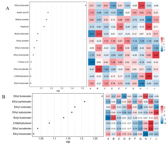To further clarify the key components contributing to differences in the style characteristics of different A. arguta wines, a partial least squares discriminant analysis was performed based on volatile components with an OAV > 1 (Figure 8B). The results show that ethyl butanoate, ethyl pentanoate, ethyl crotonate, ethyl isobutyrate, butyl butanoate, 2-methylbutanal, ethyl isovalerate, and ethyl hexanoate were the main contributing components.