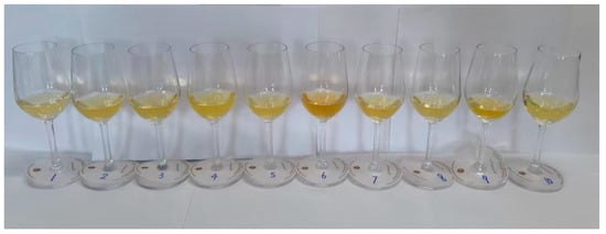 ΔE*ab values were calculated for the ten samples, using the ‘Kuilv’ sample with the highest L* value as the base value. They were calculated according to the range of color difference units NBS (National Bureau of Standards units) given by the CIE 1976 (L*a*b*) color space system to describe the degree of color difference between wine samples []. The values in Table 5 show that the color difference between ‘Kuilv’ and the other nine varieties was small.
