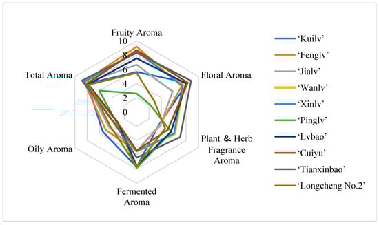 Alcohol compounds are important contributors to wine flavor and are the main products derived from yeast during alcoholic fermentation via sugar catabolism or amino acid decarboxylation and deamidation []. Table 7 shows the highest alcohol content detected in the A. arguta wine was in ‘Fenglv’ at 26,053.39 mg/L, followed by ‘Cuiyu’ at 25,931.00 mg/L, ‘Longcheng No.2’ at 25,671.24 mg/L, ‘Pinglv’ at 25,656.39 mg/L, ‘Lvbao’ at 25,162.66 mg/L, ‘Kuilv’ at 24,583.40 mg/L, ‘Tianxinbao’ at 24,539.92 mg/L, ‘Xinlv’ at 24,459.99 mg/L, ‘Jialv’ at 24,232.49 mg/L, and ‘Wanlv’ at 23,038.88 mg/L. Alcohols accounted for the largest proportion of components in each variety. Alcohols were previously reported to contribute at least 65% of the aroma characteristics of A. arguta wine []. The alcohol aroma component is mainly composed of alcohol and brandy flavors, which can give the wine a sense of complexity. Therefore, ‘Fenglv’ has a strong mellow feel.