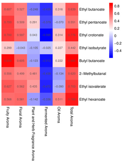 The A. arguta wine samples were clear, transparent, and lustrous. ‘Pinglv’ was more oxidized and, therefore, its samples were darker in color, while the other varieties were pale yellow (Figure 10). The organoleptic evaluation was carried out by using the descriptors ‘fruity aroma’, ‘floral aroma’, ‘plant and herb fragrance aroma’, ‘fermented aroma’, ‘oily aroma’, and ‘total aroma’ to evaluate the aroma profile of the A. arguta wines. QDA is a descriptive analytical test that combines qualitative and quantitative methods to analyze sensory data using statistical methods []. Statistical analyses showed that the samples differed in each descriptor (Figure 11). These significant differences indicated that the flavor intensity of each sample was significantly different. The ‘fruity’ and ‘floral’ aromas are the most fundamental parts of A. arguta wine’s flavor. Therefore, these two aroma characteristics are important indicators of aroma quality. As can be seen from the GC-IMS results, esters provided the largest variety of volatile flavor substances. Esters contribute to the desirable fruity sensory profile of A. arguta wines. ‘Fenglv’ had a ‘fruitier’ flavor compared with the other samples, which was consistent with the GC-IMS results. Of the ten A. arguta wines, ‘Fenglv’ had the highest total ester content. ‘Tianxibao’ showed higher floral aromas. In addition, ‘Tianxibao’ also showed a high botanical and herbal aroma, and butyraldehyde, octanal, pentanal, and glutaraldehyde may be closely related to the description of that aroma, i.e., aldehydes and alcohols are usually associated with ‘green’, ‘botanical’, etc. The total ester compounds in the GC-IMS were the highest of all the wines. In the GC-IMS results, nine aldehydes were detected, with ‘Tianxibao’ having the highest aldehyde content at 2505.63 mg/L. Fermentation flavors are mainly produced in the fermentation and aging stages. All the varieties of A. arguta wines had a low oil aroma. The total aromas, from highest to lowest, were ‘Tianxibao’, ‘Fenglv’, ‘Xinlv’, ‘Wanlv’, ‘Jialv’, ‘Cuiyu’, Kuilv’, ‘Lvbao’, ‘Longcheng No.2’, and ‘Pinglv’. The OPLS-DA analysis screened eight key volatiles, mainly esters, in the aroma substances of A. arguta wines based on OAVs > 1 in the volatile fractions of the different samples, whose aroma profiles were mainly fruity and floral. Meanwhile, in the correlation analysis between the key volatile substances and the sensory flavors (Figure 12), the red boxes have positive Pearson correlation coefficients. The results show that the esters such as ethyl butanoate, ethyl pentanoate, ethyl crotonate, butyl butanoate, ethyl isovalerate, and ethyl hexanoate were positively correlated with ‘fruity’ and ‘floral’ aromas, and all the key aroma substances were positively correlated with the overall aroma of A. arguta wine. This suggests that the eight compounds with VIP > 1 based on OAVs may influence the differences between groups.