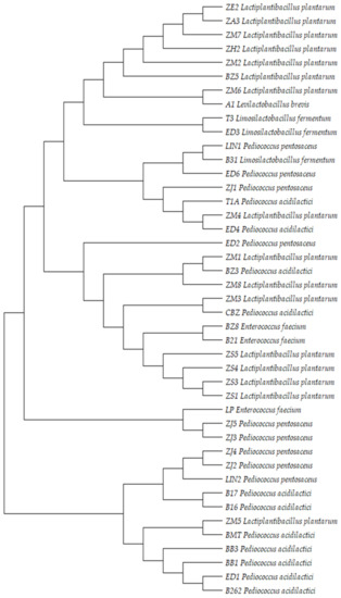 The predominant species found in sauerkraut was Lactiplantibacillus plantarum (15 isolates), while 12 isolates from the fermented beverages were identified as Pediococcus acidilactici. The other five isolates from sauerkraut were identified as Pediococcus pentosaceus. The five fermented beverage products presented a higher variety of LAB: Limosilactobacillus fermentum (3 isolates), Enterococcus faecium (3 isolates), Levilactobacillus brevis (1 isolate), Lactiplantibacillus plantarum (1 isolate) and Pediococcus pentosaceus (3 isolates).