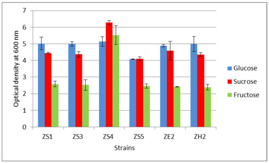 The highest optical density of 6.33 was achieved by strain ZS4 cultivated with sucrose as a carbon source, and the lowest by strain ZH2 with fructose (2.41). Comparison of the results demonstrates that the effect of the carbon source on EPS production is not related to that on biomass accumulation by each strain.
