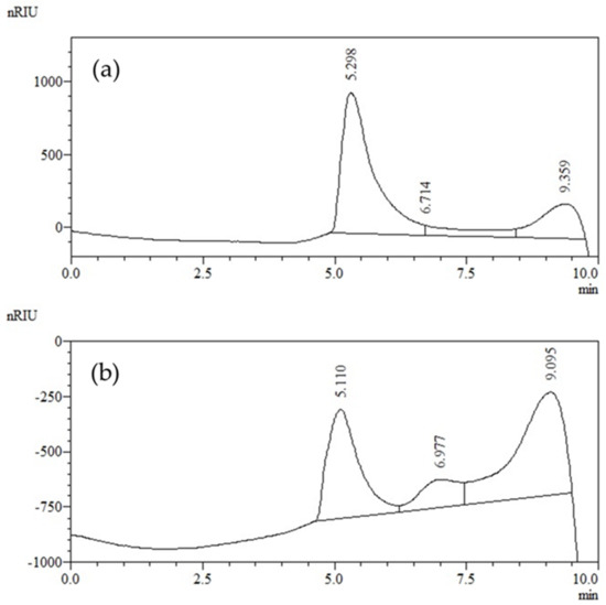 HPSEC was used for the characterization of the two EPS samples (Figure 3). Product EPS-1 was found to elute within one main peak. It covered the mass range between 40 × 104 g/mol and 70 × 104 g/mol. The high-molecular-weight (HMW) fractions (retention time (RT) 5.0–6.0 min) occupied a higher percentage (70%) of the total (100%) peak area, hence the highest percentage of EPS-1. As shown in Figure 3a, sample EPS-1 exhibited a small peak of smaller size, which eluted at an RT of 8.5–9.5 min. This suggested a small amount of EPS-1 fraction (21%) having a mass range between 10 × 104 g/mol and 1 × 104 g/mol.