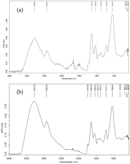 The FTIR spectra of the EPS samples (2 mg) were recorded in the region of 4000–500 cm−1 using the attenuated total reflection technique on Tenzor 27 (Bruker, Rheinstetten, Germany), controlled through OPUS 8.7. software. The two spectra were analyzed in Spectragryph 1.0 software (Dr. Friedrich Menges, file version 1.0.0.0).