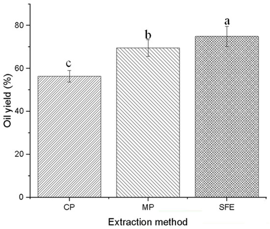 The yield of pumpkin seed oil by cold pressing, microwave-pretreatment pressing, and supercritical fluid extraction. Within each extraction method, different letters denote statistically significant differences for p < 0.05.
