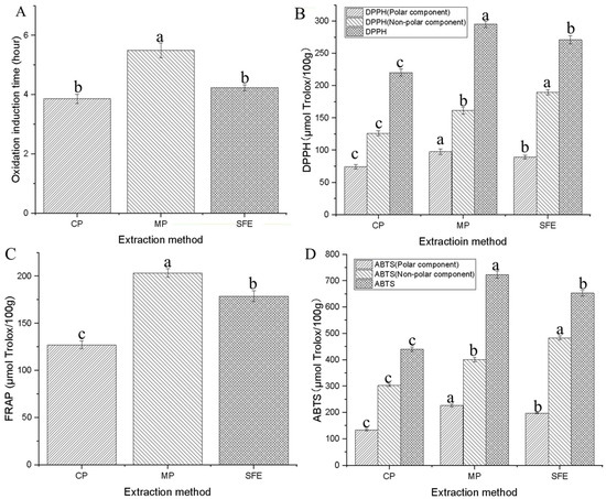 Antioxidant capacity of pumpkin seed oils: (A) oxidation induction time, (B) DPPH, (C) FRAP, (D) ABTS. Within each extraction method, different letters denote statistically significant differences for p < 0.05.