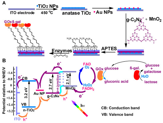 - Çakıroğlu, B.; Demirci, Y.C.; Gökgöz, E.; Özacar, M. A Photoelectrochemical Glucose and Lactose Biosensor Consisting of Gold Nanoparticles, MnO2 and g-C3N4 Decorated TiO2. Sens. Actuators B Chem. 2019, 282, 282–289. [Google Scholar] [CrossRef]