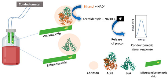 - Madaci, A.; Raffin, G.; Hangouet, M.; Pages, C.; Jose, C.; Martin, M.; Ferkous, H.; Bouzid, A.; Bausells, J.; Alcacer, A.; et al. A Microconductometric Ethanol Sensor Prepared through Encapsulation of Alcohol Dehydrogenase in Chitosan: Application to the Determination of Alcoholic Content in Headspace above Beverages. J. Mater. Sci. Mater. Electron. 2021, 32, 17752–17763. [Google Scholar] [CrossRef]