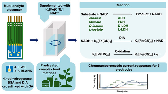 Over the last five years, no significant increase in reports regarding new methods of organic acid detection was made. Many of the biosensors used for detecting food-related organic acids have undergone slight modifications to their existing architecture. These modifications were mainly focusing on incorporating novel nanocomposites or electroactive particles to increase sensor sensitivity (see Table 5). A big spike in publications was noted for lactate-specific biosensors explicitly developed for medical and patient care purposes though. This work is intentionally not covered in the current review, as the application of these sensors has not been tested in food samples or for the food industry. However, the currently very active research on medical lactate sensors may simplify or accelerate the development of multi-analyte biosensors for complex food matrices. Another study announced a sophisticated enzyme-based sensor system for multiparametric detection of three organic acids and ethanol [84]. The sensor design included four enzymes, Candida boidini formate dehydrogenase (EC 1.2.1.2), Bacillus stearothermophilus and Lactobacillus leichmanii lactate dehydrogenases (specific for the L-lactate isoform, EC 1.1.1.27, and the D-lactate isomer, EC 1.1.1.28, respectively), as well as Saccharomyces cerevisiae alcohol dehydrogenase (EC.1.1.1.1). The detection principle was similar for these four biocatalysts. It relied on the anodic oxidation of the enzymatically produced mediator K4[Fe(CN)6] in the presence of the regenerating cofactor NAD+ (Figure 5).