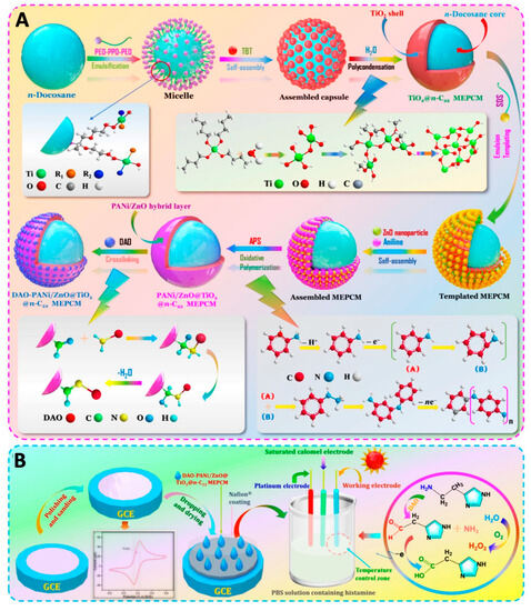 The use of bi-enzymatic biosensors combining diamine oxidase with horseradish peroxidase (HRP) was reported for the detection of BAs as well. Both enzymes were immobilized onto the surface of the SPCE using glutaraldehyde (GA) and BSA cross-linking. The biosensor was fabricated for the detection of histamine-producing bacteria by measuring the signal generated in the presence of histamine, producing a good analytical performance [100]. The same crosslinking method using GA and BSA was also used by [101] to immobilize DAO. They found that the concentration of GA had a more pronounced effect on the response of the sensor than BSA. BSA and GA concentrations of 3% and 0.5% were selected, which was considered as the best compromise between the analytical signal and the precision of the biosensor [101]. In a later study, they simplified the biosensor construction by only using GA for the immobilization of DAO and optimisation of the electrochemical oxidation by adding ferricyanide ([Fe(CN)6]3−) as a redox mediator, thereby improving the sensitivity more than 100-fold [102]. Hidouri and co-workers reported a sensitive bi-enzymatic, potentiometric histamine sensor, which produced a highly specific response to histamine and showed the lowest detection limit of less than 10 nM [103]. The use of DAO commonly generates hydrogen peroxidase (H2O2) which requires the application of a high potential when it is to be detected by oxidation on the electrode. This in turn can create interfering signals from other electroactive species. Incorporating Prussian blue [iron(III) ferrocyanide], which acts as an artificial peroxidase, to modify the electrode enables H2O2 detection at a lower potential and thus can avoid interference [104]. A smart electrochemical biosensor based on the DAO-PANI/ZnO@TiO2@n-C22 MEPCM-modified GCE as a working electrode was developed as illustrated in Figure 6. The strategy aimed for enhancing histamine detection in high-temperature environments. The biosensor showed higher sensitivity, and lower LOD at a high assay temperature compared to conventional biosensors without phase charge materials [105].