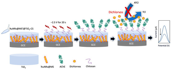 An investigation of the effect of doping Au nanorod core shell nanoparticles formed on mesoporous silica (AuNRs@MS) into the TiO2-chitosan film hydrogel was conducted in relation to an OP biosensor [113]. The hydrogel films have a mesoporous nanostructure, which in a previous study showed an improved AChE loading efficiency and thus produced a stable AChE biosensor [114]. The MS shell was thought to protect the AuNRs from aggregation, while its porous structure should allow the transport of ions, ensuring the enhancement effect of AuNRs on the electroconductivity and electrocatalytic activity. In addition, small molecules are able to permeate through the MS shell and assure contact of TCl with the electrocatalytic AuNRs. The biosensor was used to detect dichlorvos and fenthion (Figure 7). The doping significantly enhanced the electroconductivity of the TiO2-chitosan hydrogel and dramatically improved the bioelectrocatalytic activity and OP detection sensitivity of the immobilized AChE matrix.