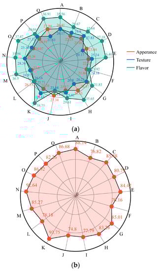 Sensory analysis is a series of observations, analyses, and descriptions of grapes performed through human senses [35]. To examine aroma characteristics and evaluate the comprehensive quality of the grape, 15 wine professionals scored the appearance according to the shape, size, color, and weight of the grape. The texture parameters were scored according to the degree of softness and hardness of grape pulp, the abundance of juice and water, and the brittleness of grape pulp. The flavor parameters were scored according to the coordination of sweet and sour, characteristic aroma, and pure flavor. The sensory evaluation scores and comprehensive scores of different table grape varieties are shown in Figure 2. In appearance, the score of Shine-Muscat (28.36 points) was higher than that of other varieties. The appearance scores of the other varieties had no significant difference. In terms of texture, the experts preferred the crispy grape varieties. Ruby Seedless, Shine-Muscat, Italia, black beet, and Heibaladuo had higher texture scores than other varieties, among which Ruby Seedless scored the highest (29.62), while Sunmmer Black, with its soft fruit, scored the lowest (20.17). Varieties with a score of more than 35 on the flavor level were Heibaladuo, Sunmmer Black, Ruby Seedless, Shaoxing 1 hao, A, Jumeigui, Hutai 8 hao, and Shine-Muscat. The flavor scores of Meixiangbao, Zhengyanwuhe, and Ruiduwuheyi were below 30 points, and the varieties had bad flavor and no considerable aroma. Ruby Seedless and Shine-Muscat scored a combined score of more than 90, higher than the other varieties, and are popular for their rich aroma, crispy texture, and sweet and sour taste. Sweet Sapphire tasted sour after ripening, was crisp but astringent, and had a comprehensive score of only 74.81 points.