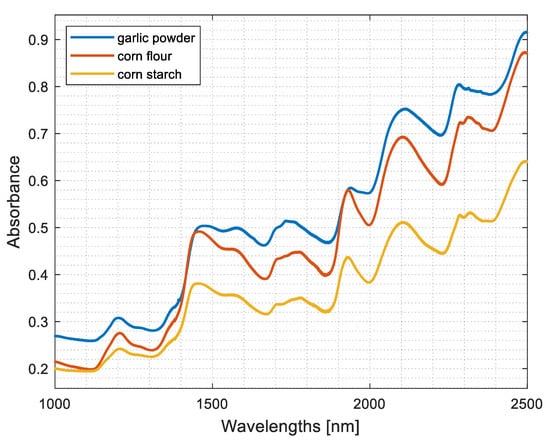 It becomes evident that the spectrum of corn starch is the most dissimilar compared to the spectra of garlic powder and corn flour. These differences are expressed as a systematic increase in absorbance values in the upper range of the NIR spectrum, namely from 1400 nm. Differences between these spectra can be found around 1445 nm, 1930 nm, and 2225 nm.