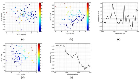 Projection of the FT-NIR spectra of ground and dried garlic samples adulterated with corn flour onto (a) PC 1 and PC 2 as well as (b) PC 1 and PC 3. (c) Loading values on PC 3. Projection of the FT-NIR spectra of ground and dried garlic samples adulterated with corn starch onto (d) PC 1 and PC 2. (e) Loading values on PC 1.