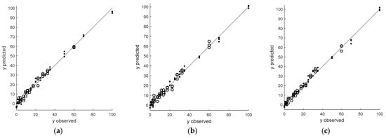 Figure 3a presents the principal component regression model. It was constructed for the original FT-NIR spectra describing ground and dried garlic samples adulterated with different amounts of corn flour. Figure 3b,c displays the predictions of two PCR calibration models constructed for the original spectra and the optimally transformed ones estimating the amount of corn starch added to ground garlic samples.