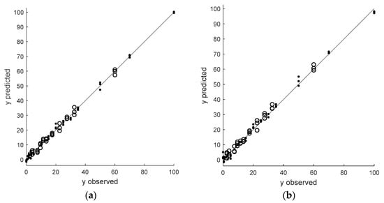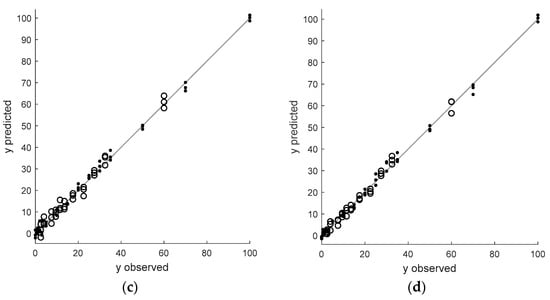 The performance of all latent variable models constructed in this study is visualized as a diagram where predicted values of adulterant concentration using a model are plotted versus the observed concentration. In these diagrams, black lines (with a slope equal to one) represent an ideal situation, i.e., no difference between observed values of the dependent variable and the predicted ones using a given calibration model. Calibration and independent validation samples are indicated as dots and circles, respectively.