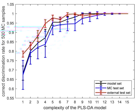 In Figure 5, the average correct classification rates are presented as a function of model complexity along with their uncertainties of estimation. The optimal PLS-DA model included seven latent variables, and their number was selected based on evaluating the correct discrimination/classification rates.