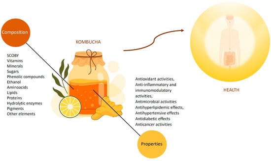 One popular beverage that has been gaining visibility is Kombucha. Kombucha is a traditional Chinese beverage made of sweetened tea (mainly black or green; however, other variants of tea and also other ingredients, such as cereals, milk, and even mushrooms, may be used) fermented by a specific combination of probiotic microorganisms. Kombucha mainly comprises tea polyphenols, amino acids, vitamins, minerals, organic acids, sugars, and probiotic microorganisms. This is a functional beverage that has a high amount of plant extracts and metabolites resulting from the metabolism of the symbiotic culture of bacteria (mainly Lactobacillus and Bifidobacterium species) and yeasts (mainly Saccharomyces species), known as SCOBY, [17,18]. According to the literature, Kombucha has been shown to have physiological benefits, such as anti-inflammatory, antibacterial, and antioxidant activities, alongside other properties. Consequently, it qualifies as a functional beverage [19,20,21] (see Figure 1).