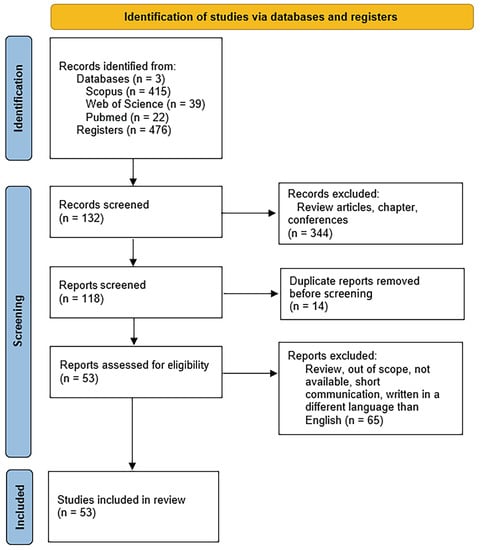 This systematic review identified 476 scientific articles published in international journals indexed to the digital databases used in this search. After screening, duplicate publications and research that fitted the exclusion criteria were removed. Thus, after the eligible criteria were applied, fifty-three publications met the defined inclusion criteria, as shown in the PRISMA flow diagram presented in Figure 2. A summary of the most important characteristics of these articles is presented in Table 1.