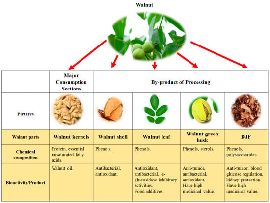 Walnuts have high economic value and are rich in protein, minerals, fatty acids, phenolic compounds, phytosterols, and dietary fiber. Walnuts consist of walnut green husk, walnut shell, Diaphragma Juglandis Fructus (DJF), and walnut kernel (Figure 1), exhibiting health-protective, antibacterial, anti-inflammatory, anti-fungal, and free radical scavenging activities [3]. The walnut kernel is the main part of the walnut consumed due to its high nutritional value, including rich protein and essential unsaturated fatty acids. It can be processed and made into candies, drinks, ice cream, cakes, etc., and is one of the world’s four major nuts [4]. The remaining parts become by-products of walnut kernel processing. Walnut by-products contain a large number of polyphenols, polysaccharides, and other biologically active substances, which have strong development potential for their added value.