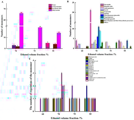 Number of monomers (A), monomer classification (B), and monomer duplication (C) obtained from different extraction sites at different ethanol volume fractions.