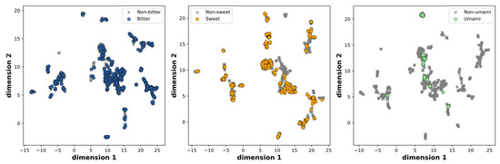 Scatter plot of the UMAP dimensions. Molecules are colored on the basis of bitter, sweet, and umami.