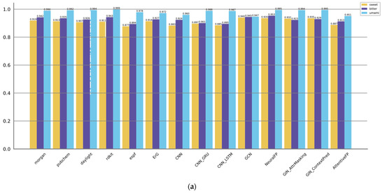 For predicting sweet taste, the GNN-based models (GCN, NeuralFP) and fingerprint-based models (Morgan, PubChem, ErG) exhibit better performance metrics compared to the CNN-based models. Notably, GCN and NeuralFP stand out by achieving high accuracies of 0.869 and 0.896, respectively. Moreover, these models showcase excellent F1 scores of 0.813 and 0.812, underscoring their efficacy in accurately predicting the sweetness of molecules. Furthermore, these models showcase satisfactory precision, sensitivity, and specificity, suggesting a balanced ability to correctly identify both positive and negative samples. It can also be proved by AUROC and AUPRC values; GCN and NeuralFP are also listed as the top two.