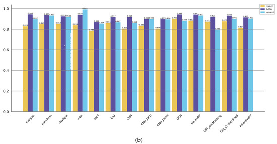 For example, Cristian Rojas et al. proposed a Quantitative Structure–Taste Relationship (QSTR) expert system to predict the sweetness of molecules based on conformation-independent extended-connectivity fingerprints (ECFPs) and molecular descriptors. This QSTR model can better understand the relationship between molecular structure and sweetness, which can be used for the design of new sweeteners [9]. Suqing Zheng’s team trained machine learning models named e-bitter and e-sweet based on ECFPs and 2-D Dragon descriptors to predict sweeteners and bitterants, respectively [8,10]. Weichen Bo et al. established a regression-based model that can predict the structure–taste relationship. They used trained deep learning algorithms based on neural networks based on RDKit Fingerprints, molecular descriptors, and molecular images [12]. Tuwani et al. introduced a machine learning technique for predicting both the bitterness and sweetness of small molecules. Their methodology involved the application of the Boruta algorithm for feature selection and principal component analysis for dimensionality reduction. Classification models were then constructed using algorithms like random forest (RF), ridge logistic regression, and AdaBoost. To decipher the critical features and feature groups influencing bitter and sweet perceptions, SHAP analysis was employed [11]. Goel et al. explored the use of diverse regression models, such as RF, MLP, GBR, XGB, etc., to predict molecular sweetness. Through a comprehensive evaluation of these regression models, it was determined that GBR and RF yielded the most accurate results in sweet taste prediction, boasting correlation coefficients of 0.94 and 0.92, respectively [6]. Dagan-Wiener et al. devised a tool named BitterPredict (1.0), aimed at forecasting the bitterness of molecules through an analysis of their chemical structures. By utilizing the QikProp (3.9) software, they computed various physicochemical and ADME/Tox properties. Subsequently, an AdaBoost classifier was constructed [13].