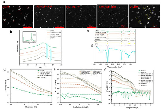 Microscopic images of crystals under PLM (a, scale bar = 50 μm); XRD pattern (b); FTIR pattern (c); and macroscopic rheological pattern (d–f) of oil dispersions in different ratio systems of SE and BW.