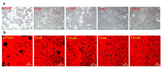 Firstly, W/O emulsions with 40 wt% of the aqueous phase were prepared using different concentrations of SE. Figure 3 shows the optical microscopy and CLSM images of the W/O emulsions at different SE concentration gradients. Figure 4 shows the appearance and droplet distribution of W/O emulsions in this system. In Figure 1b-1,b-2, it can be seen that only SE concentrations greater than 2% resulted in more stable emulsions, while all emulsions with concentrations below 2% showed varying degrees of oil leakage. Figure 3a and Figure 5a show the optical microscope images and particle size distributions, respectively, of W/O emulsions with different SE concentrations. It can be seen that the emulsion droplets gradually became smaller and the particle size decreased as the SE concentration increased. Luo et al. [26] investigated a preparation of W/O emulsions from tea polyphenol palmitate particles and found that the particle size of emulsified droplets decreased as the concentration of tea polyphenol palmitate particles increased. Figure 3b shows CLSM images of the oil phase stained with Nile Red, which is shown as red, and the aqueous phase is black. These images indicate that the emulsions prepared in the SE concentration gradient system were indeed W/O emulsions. The variation in the droplets was consistent with the results observed in the optical microscope.