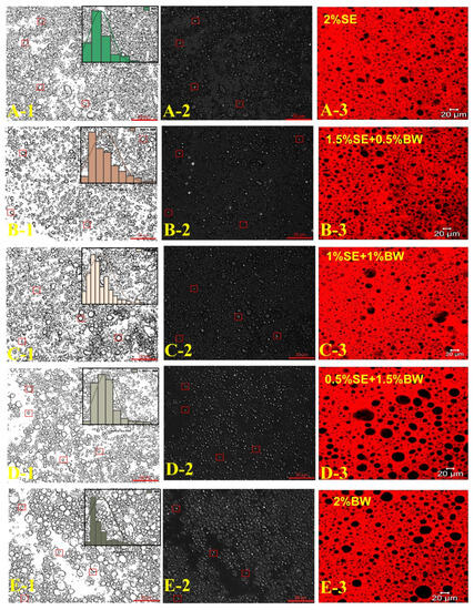Microscopy images of BM (A-1,B-1,C-1,D-1,E-1), PLM (A-2,B-2,C-2,D-2,E-2) and CLSM (A-3,B-3,C-3,D-3,E-3) of W/O emulsions in different ratio systems of SE and BW (scale bar = 20 μm).