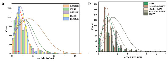 (a) The particle size distribution of W/O emulsions with different SE concentrations; (b) particle size distribution of emulsions with different proportions of SE and BW.