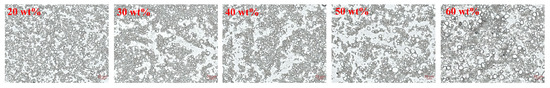 After BW was introduced into the SE system, emulsions containing a 40 wt% water phase were successfully prepared under different ratios of SE and BW. Fresh emulsions with different mixing ratios all exhibited a uniform steady state. The prepared emulsions did not flow when inverted, and presented a gel state (Figure 1c). Figure 4 and Figure 5b show the size distribution and optical microscopy images of W/O emulsions with different SE and BW mixing ratios, respectively. It can be seen that the droplets stabilized by SE were irregular in shape and tended to form droplet clusters compared with those stabilized by BW alone, while the droplets stabilized by BW alone were mostly regular round droplets. In the 40 wt% aqueous phase condition, a small amount of BW was added to the SE emulsion system (1.5% SE: 0.5% BW), and the droplets became smaller. The addition of a small amount of BW made the droplets of the SE system more regular and homogeneous. This phenomenon might be due to the fact that a small amount of BW cooperates with SE to stabilize the interfacial film and enhance stability. However, when the amount of BW added continued to increase (i.e., 1% SE:1% BW and 0.5% SE: 1.5% BW), the droplets became larger and tended to aggregate. From the previous PLM image of the oil dispersions (Figure 2a), it can be seen that in canola oil, both BW and SE were spherical crystals [13,27]. As the extent of BW substitution for SE increases, BW and SE (both spherical crystals) can compete for adsorption to the interfacial membrane, which adversely affects the emulsion system originally stabilized by SE. Similar results were obtained by Khakhanang et al. [28], who prepared stable W/O emulsions using rice bran wax (RBX) and glycerol monostearate (GMS). They found that GMS altered the growth behavior of RBX when the wax content was relatively high, which further hindered the growth of wax crystals and reduced the emulsion stability. This was similar to the results of our microstructural diagram, which revealed a stable W/O emulsion at low BW content, where a small amount of BW acts synergically with SE to stabilize the emulsion. However, with the further replacement of SE by BW, BW and SE compete for adsorption at the oil–water interface at this time, so the optical and laser confocal microscope images reflect that the droplet size gradually increased. As shown in the PLM plots of Figure 4, the BW and SE crystals were dispersed in the continuous phase, and the dispersed phase was wrapped in the crystal network of the continuous phase. The figure also shows the crystal shell around the droplet (in the red box), which indicates that the crystals stabilize the emulsion at the interface. This result was similar to the findings of Hong et al. [18], who prepared W/O emulsions from candelilla wax and found that the wax crystal particles formed interfacial crystals at the interface, preventing droplet flocculation. In the CLSM images of Figure 4, the black spherical distribution in the oil phase can be clearly observed, indicating that the prepared emulsion was indeed a W/O emulsion. It can be seen that when a small amount of BW replaced SE, the droplet size of the W/O emulsion system decreased. When BW further replaced SE, the droplets were gradually larger. This result was consistent with the previous micrographs obtained with the optical microscope. Next, the ratio of SE to BW in the oil phase was fixed (1.5% SE: 0.5% BW), and the ratio of oil to water was adjusted to further study the stability of emulsions with higher water phases in this mixing system. As expected, with the increase in the internal water phase, it became more and more difficult to homogenize the emulsion, and it was impossible to prepare a complete W/O emulsion under 70% water phase. When the water content was less than or equal to 60%, the emulsions showed good stability and could be stored for one month without obvious phase separation (Figure 1d). Figure 6 shows the microstructure of W/O emulsions with different water phases, from which it can be seen that in the continuous phase of W/O emulsion with 20 wt% internal water phases, the regular droplets were relatively sparse. With the increase in internal water phase content, the connection between droplets became closer, and some droplets were found to be clustered together. This was due to the clustering of droplets resulting from the crystals of SE and BW acting as binders in the oil phase of the emulsion system [29]. It was also found that relatively irregularly shaped droplets appeared when the aqueous phase content was further increased above 50 wt%, and even some apparently deformed droplets as well as droplet coalescence were observed. Similar droplet aggregation phenomena were found in the studies of Khakhanang et al. [28] and Yu Lu et al. [30].