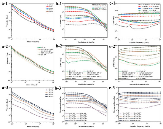 Rheology plays an important role in evaluating the physical properties of emulsions, so it is considered an important parameter in clarifying the complex structure of emulsion products. A series of shear rate scanning, strain scanning and frequency scanning tests were performed on these different systems using the DHR-3 rheometer. Figure 7a shows three rheological scanning data graphs of water-in-oil emulsions with different SE concentrations. The apparent viscosity of the emulsions decreased exponentially with increasing shear rate and exhibited shear thinning behavior, indicating that the prepared emulsion systems were all yielding-pseudoplastic fluids (Figure 7a). In the concentration gradient system of SE, the concentration of SE increased, the particle size of droplets decreased, and droplets approached each other, forming an aggregated droplet and crystalline network, leading to an increase in the apparent viscosity of the emulsion system (Figure 7a-1) [13,26,31]. However, in the SE/BW ratio system, the system with the appropriate amount of BW added to SE showed the highest viscosity, and if BW continued to replace SE, it decreased the system viscosity. This might be due to the fact that in rapeseed oil, both BW and SE are spherical crystals, which can be more easily adsorbed at the interface due to their wettability as compared with other shapes of crystals [32]. Compared with the previous PLM images (Figure 2a), in the mixed system with the addition of appropriate amounts of BW and SE, both spherical and fine crystals were present, and the crystals were more likely to adsorb at the interface at this time than in other mixed systems, synergistically stabilizing the emulsion and enhancing its internal structure. At the same time, the viscosity of the system increased due to the interaction per unit volume [33]. When the proportion of BW continues to increase, the two fine crystals of SE and BW compete for adsorption at the oil–water interface, and the strength of the internal structure of the emulsion decreases so that it becomes susceptible to disruption and viscosity reduction [34]. Figure 7a-3 shows the flow scanning results of W/O emulsions (fixed SE and BW ratios) with different oil/water ratios. The results show that the viscosity increased with the increase in water content, which indicates that the increase in water content strengthened the network structure of the system.