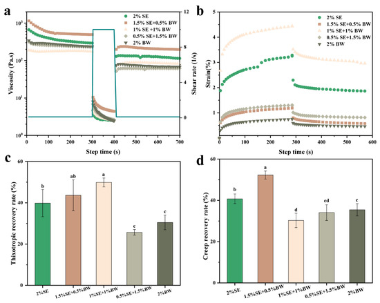 3ITT and creep-recovery experiments for W/O emulsions prepared with different SE and BW ratios (a,b), and their respective recoveries (c,d). The green line in (a) shows the shear rate applied in different time periods. Different letters in c and d indicate significant differences, p < 0.05.