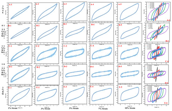 In the nonlinear region with a lot of deformation, LAOS provides structural information as a quick qualitative graphic representation to better understand physical changes caused by deformation during processing or chewing [38]. Figure 9 is an elastic Lissajous–Bowditch diagram of emulsions with a water content of 40% W/O prepared with different proportions of SE and BW. Under the strain of 1%, the curve was oval regardless of the ratio of SE to BW, indicating that the sample was dominated by elastic behavior. With increasing strain, the shape of the curve was observed to be gradually distorted and deformed, indicating enhanced viscous dissipation, which was related to the permanent deformation and flow behavior of the microstructure of the emulsion [35]. Compared with the single SE system and the single BW system, with the increase in the proportion of BW in the SE system, the structure of the emulsion was greatly deformed under the strain, and the scanning results were relatively discrete, indicating that the emulsions formed with large proportions of BW and SE were loose and easily affected by the external force. After adding an optimal amount of BW to SE, the network structure and interactions between droplets were enhanced because both SE and BW formed spherical crystals and the droplets were tightly stacked to synergistically stabilize the emulsion.