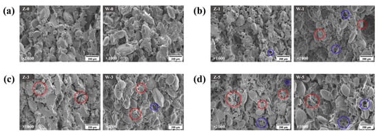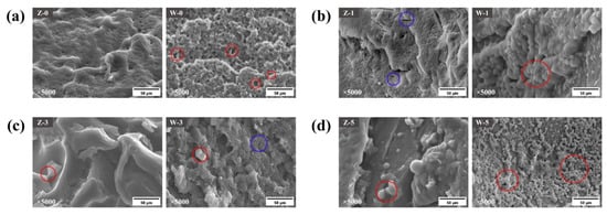 SEM images of dumpling wrappers in control treatment (a), first (b), third (c), and fifth (d) freeze–thaw cycle. Letters “Z” and “W” mean Zhaomai and Wenmai 19, respectively. Red circle, damaged protein network; blue circle, ice crystals.