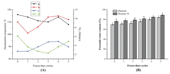 (A): Thermal properties of gliadins under freeze–thaw cycles. (a) Zhaomai’s denaturation temperature; (b) Wenmai 19’s denaturation temperature; (c) Zhaomai’s enthalpy; (d) Wenmai 19’s enthalpy. (B): Change of freezable water content of the quick-frozen dumpling wrappers during freezing and thawing; different lowercase letters show significant differences between Zhaomai and Wenmai 19 under the different number of freeze–thaw cycles (p < 0.05).