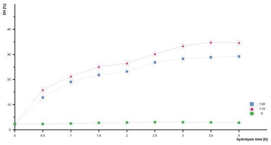 The DH is an important parameter describing enzymatic hydrolysis and may be responsible for controlling such factors as the composition and properties of peptides. The amount of enzyme can have a significant impact on the DH; therefore, the different amounts of the applied enzyme were examined (Table 4). The analysis of the effect of time and the enzyme concentration on hydrolysis efficiency revealed that there were statistically significant differences in the degree of hydrolysis obtained in samples with the 1:10 and 1:20 enzyme content relative to the amount of protein.