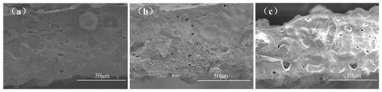 Microstructure of films: (a–c) PLA/PBAT/TPS, PLA/PBAT/TPS-SA, and PLA/PBAT/TPS-MCSA films.
