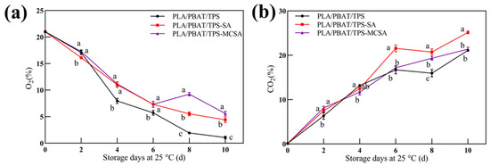 Gas composition: (a) O2 volume fraction; (b) CO2 volume fraction. Different letters indicate significant differences within each parameter (p < 0.05).