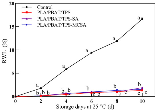 Effect of different packages on RWL of bananas. Different letters indicate significant differences within each parameter (p < 0.05).