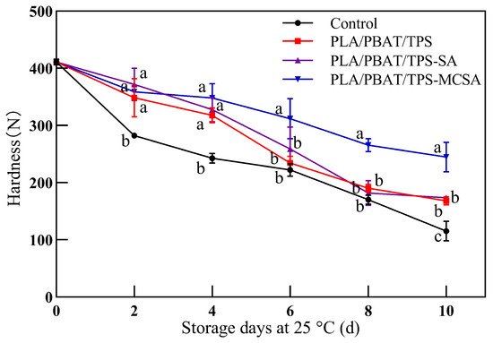 Effect of different packages on hardness of bananas. Different letters indicate significant differences within each parameter (p < 0.05).
