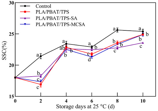 As shown in Figure 5, the SSC of bananas displays an upward trend throughout the storage period. SSC is one of the signs of a high respiration rate and is related to the aging process of fruits and vegetables [37,38]. The oxidative breakdown of nutrients in bananas, such as polysaccharides and lipids, to produce soluble polysaccharides and lipids, as well as the flow of banana contents by cell wall degrading enzymes, have led to an increase in banana SSC [39]. In addition, the solubilization of cell wall polysaccharides and hemicellulose could increase the soluble solids content of bananas [39]. The results of the SSC demonstrate that the PLA/PBAT/TPS-SA and PLA/PBAT/TPS-MCSA films exhibit a more favorable effect in retarding the ripening and deterioration of bananas during storage compared to the PLA/PBAT/TPS film. This result aligns with the observations of banana hardness, as illustrated in Figure 4.