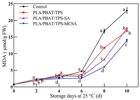 Effect of different packages on the content of MDA in bananas. Different letters indicate significant differences within each parameter (p < 0.05).