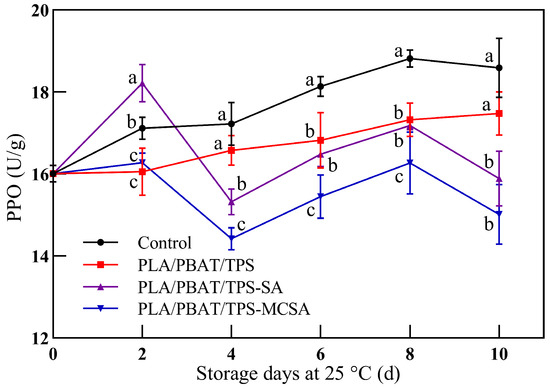 Effect of different packages on PPO activity of bananas. Different letters indicate significant differences within each parameter (p < 0.05).