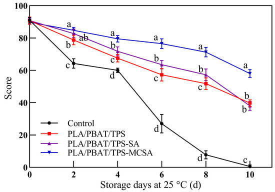 Sensory evaluation of bananas refers to the comprehensive assessment of fruit based on human sensory organs, including olfaction, tactile sensations, and visual perceptions, making it a direct indicator of their commercial value [46]. As depicted in Figure 8, the overall storage quality of bananas gradually declines over the storage period, accompanied by a decrease in sensory scores. Among the groups, the control bananas exhibit the fastest rate of sensory score decline, becoming commercially valueless by the fourth day of storage and inedible by the sixth day. Bananas from the PLA/PBAT/TPS and PLA/PBAT/TPS-SA films maintained their edibility until the tenth day, whereas those from the PLA/PBAT/TPS-MCSA film retained favorable sensory scores even towards the end of storage, preserving both commercial and edible value. The positive and proactive impact of the PLA/PBAT/TPS-MCSA film on banana preservation is evident. It significantly extends the storage period of bananas, thereby reducing commercial losses caused by spoilage. The results indicate that the PLA/PBAT/TPS-MCSA film can effectively prolong the shelf life of bananas by 4–5 days.