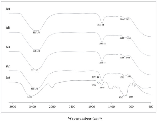 FTIR spectra of KGM and KGMHs prepared at pH 4.5 and 70 °C. (a) Native KGM; (b) KGMH prepared at hydrolysis time of 20 min, Mw = 9212; (c) KGMH prepared at hydrolysis time of 40 min, Mw = 4342; (d) KGMH prepared at hydrolysis time of 60 min, Mw = 629; (e) KGMH prepared at hydrolysis time of 120 min, Mw = 419.