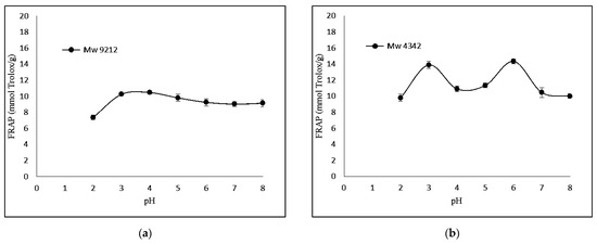 KGMHs of different molecular weights (Mw = 9212, 4342, 629, and 419) at pH 2.0–8.0 were assayed using the modified methods of [26] Benzie and Strain (1996). The Trolox standard curve was used to determine the FRAP antioxidant activity. In total, 0.0062 g of Trolox was dissolved in 50 mL of 100% methanol to yield 500 μM Trolox solution. The solution was then diluted to 100 μM by adding 10 mL of 500 μM Trolox solution into a volumetric flask and filling it to 50 mL with distilled water. The dilution was repeated using appropriate amounts of distilled water to yield the final concentrations of 20–140 µM (y = 0.00305x, R2 = 0.99).